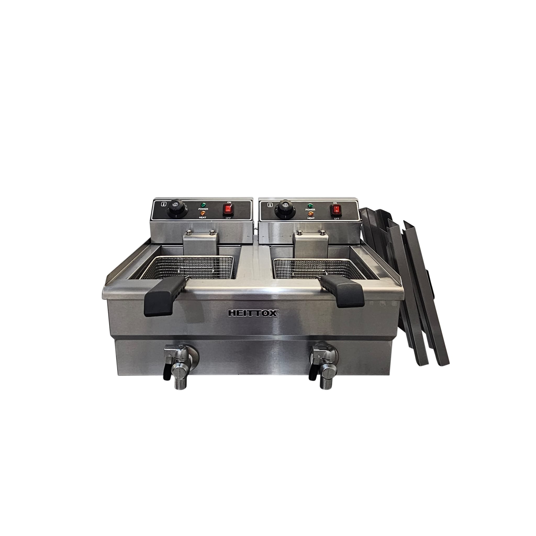 The Heittox double 11L tabletop fryer is a powerful and compact appliance designed for professional kitchens with limited space. With a 8L per tank oil capacity, precise temperature control, and a durable stainless steel construction, this fryer is perfect for cooking up crispy and delicious fried foods efficiently.