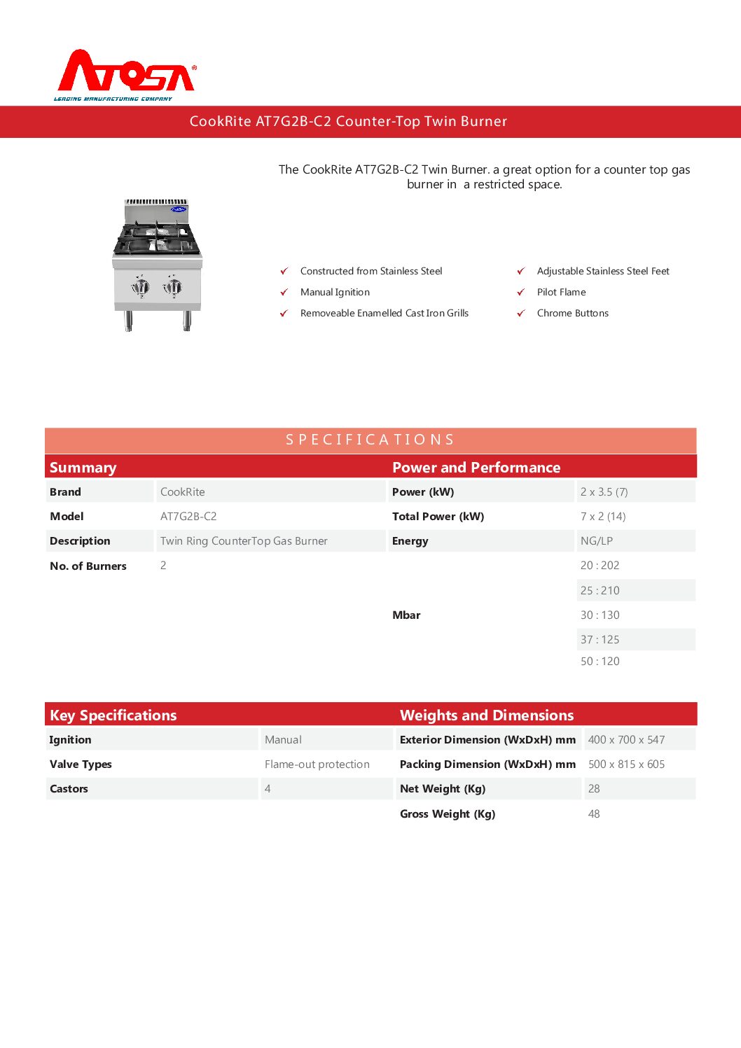 Brand CookRite / Model : AT7G4B-C2 / Description : 4 Ring CounterTop Gas Burner / No. of Burners : 4 Power and Performance : Power (kW) 4 x 3.5 (14) / Total Power (kW) 7 x 4 (28) Energy NG /LP 20 : 202 25 : 210 30 : 130 37 : 125 50 : 120Key Specifications